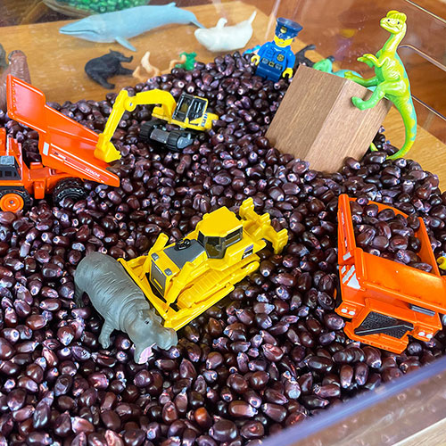 お米や豆をダンプカーに乗せてみたりショベルカーですくったりして、小さな工事現場ごっこができちゃいます。